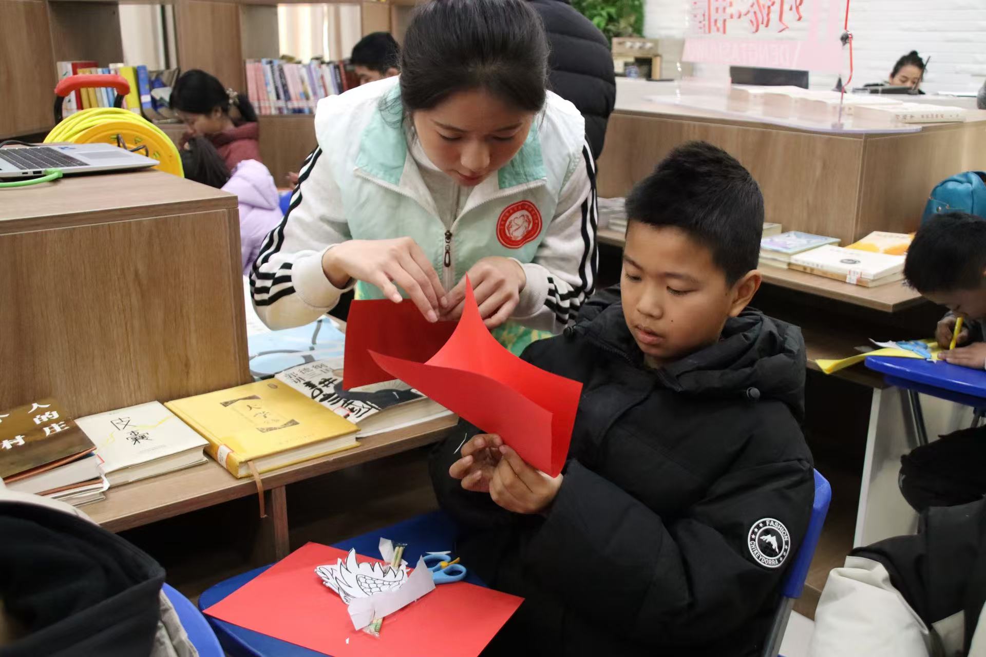 為了增進社區兒童對中華優秀傳統文化的認知和認同,活動還特別設置了“匠心龍韻”文化體驗環節。志愿者們首先向小朋友們介紹了元宵節的由來和習俗,隨后帶領孩子們制作舞龍。在一雙雙小手的努力下,一條條色彩斑斕的舞龍活靈活現,上下舞動、翻轉,寄托著大家對美好生活的憧憬與期待,使孩子們在動手實踐中感受到傳統文化的魅力。