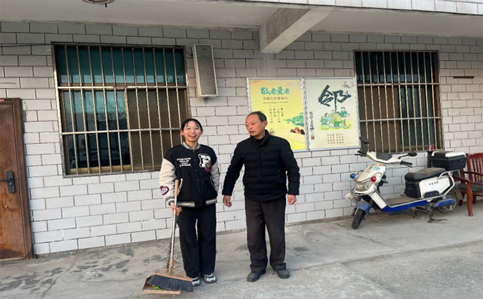 圖為商學(xué)院“科大志愿隊(duì)”同學(xué)在當(dāng)?shù)卮逦瘯?huì)打掃衛(wèi)生 房悅 供圖