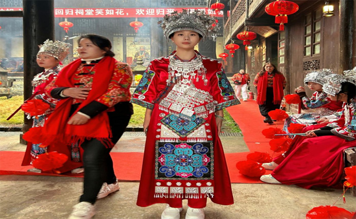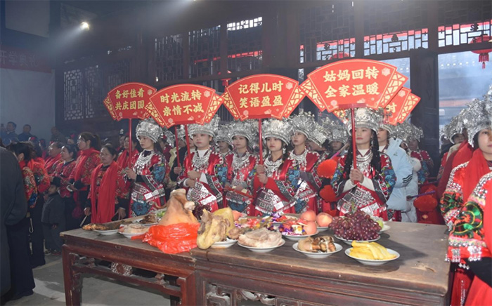 在“姑媽節”當天,實踐隊成員們與當地村民同吃同住,親身體驗了豐富多彩的民俗活動。從盛大的姑媽回娘家儀式到熱鬧的苗族歌舞表演,再到獨具特色的長桌宴,隊員們深刻感受到苗族文化的獨特魅力和深厚底蘊。特別是在祭祀宗祠上,隊員們與村民們一起參拜,共同祭祀,進一步加深了對苗族文化的理解與認同。