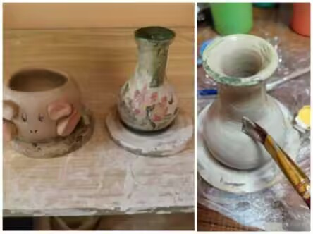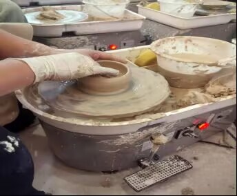陶藝大師帶領下,我和幾個小伙伴開始制陶。制作陶瓷的第一步是揉泥,一大塊陶土被放置在木質工作臺上,制陶人雙手穩穩地握住它,用力擠壓、揉搓,如同在馴服一匹不羈的烈馬。隨著揉動,陶土中的氣泡被一點點擠出,質地愈發細膩均勻,仿佛在為即將到來的蛻變積蓄力量。緊接著是拉坯環節,這是整個制作過程中最具藝術感的部分。陶土被精準地放置在飛速旋轉的拉坯機轉盤中心,制陶人輕輕蘸水濕潤雙手,而后緩緩靠近陶土。