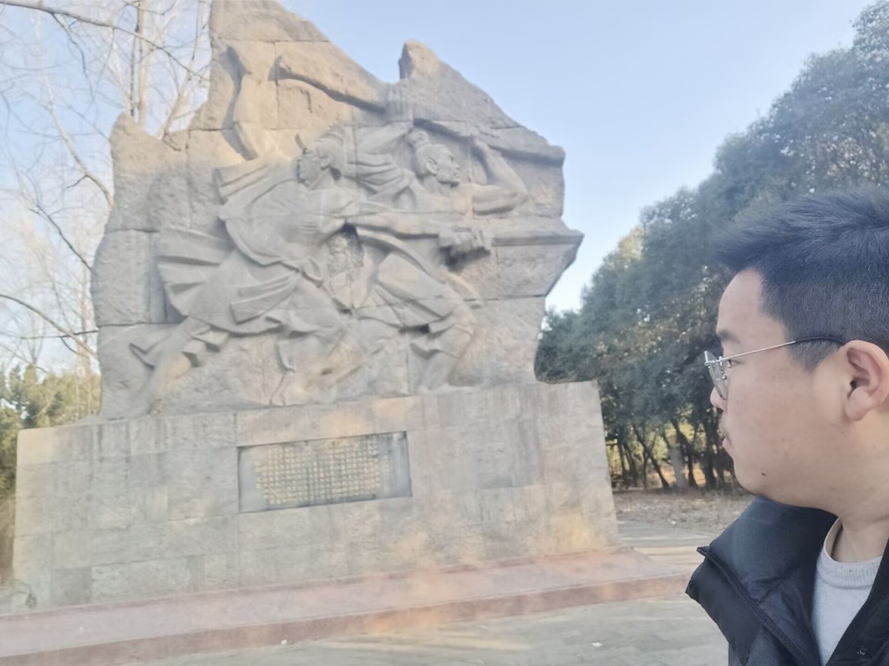 當實踐團成員品嘗完馬蹄燒餅后,便馬不停蹄的前往了大澤鄉的涉故臺村,去參觀涉故臺。當實踐團成員踏入涉故臺,仿佛穿越了千年的時光,每一處遺跡都低語著古老的故事。初見覆斗形的臺體,被綠樹環繞,環境優雅,心中不禁升起一股敬意。看那株呈龍形的柘龍樹,通體鱗甲,猶如一條守護歷史的巨龍,靜靜地凝視著歲月的變遷。在臺的南沿,陳勝、吳廣起義大型浮雕像赫然入目,陳勝手持寶劍、振臂高呼,吳廣怒目圓睜、舉棒向前,那熊熊燃燒的火炬形象,仿佛讓我看到了當年起義的壯烈場景,心中澎湃不已。走進陳勝、吳廣起義紀念館 “鴻鵠苑”,仿古建筑散發著古樸的氣息。每一方碑刻、每一件文物都是歷史的碎片,拼接起來便是一幅波瀾壯闊的農民起義畫卷。在這里,實踐團成員感受到了先輩們為反抗壓迫、爭取自由而付出的巨大犧牲和勇氣。涉故臺周圍,篝火狐鳴處、魚腹丹書灣及七十二連營等景點,每一個地名都承載著一段傳奇。這些故事在《史記·陳涉世家》中得以記載,讓實踐團成員更加深刻地理解了那個時代的背景和起義的必然性。參觀涉故臺,讓實踐團成員對歷史有了更加直觀和深刻的認識。這座偉大的歷史豐碑,不僅是中國農民戰爭和農民革命的源頭,更是中華民族不屈不撓精神的體現。這次參觀,不僅是一次歷史的追溯,更是一次心靈的洗禮。(實踐團成員觀看石刻,王士俊供圖)
