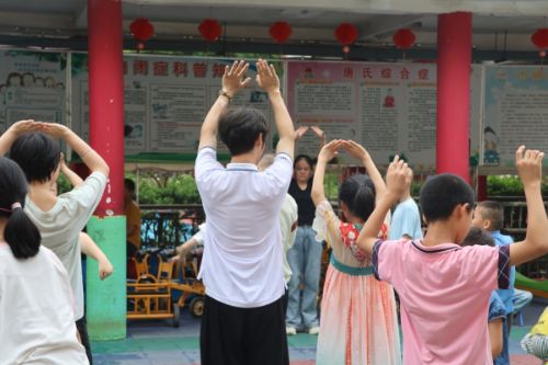 圖為實(shí)踐隊(duì)隊(duì)員與孩子們?cè)谝粔K兒做操毛昊宇攝