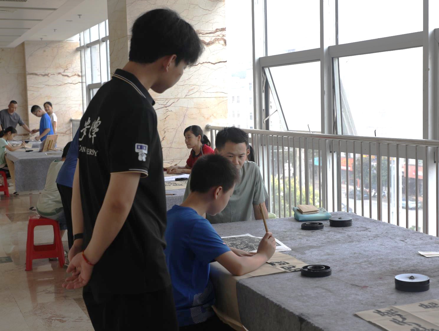 隊(duì)員與練習(xí)書法的青少年