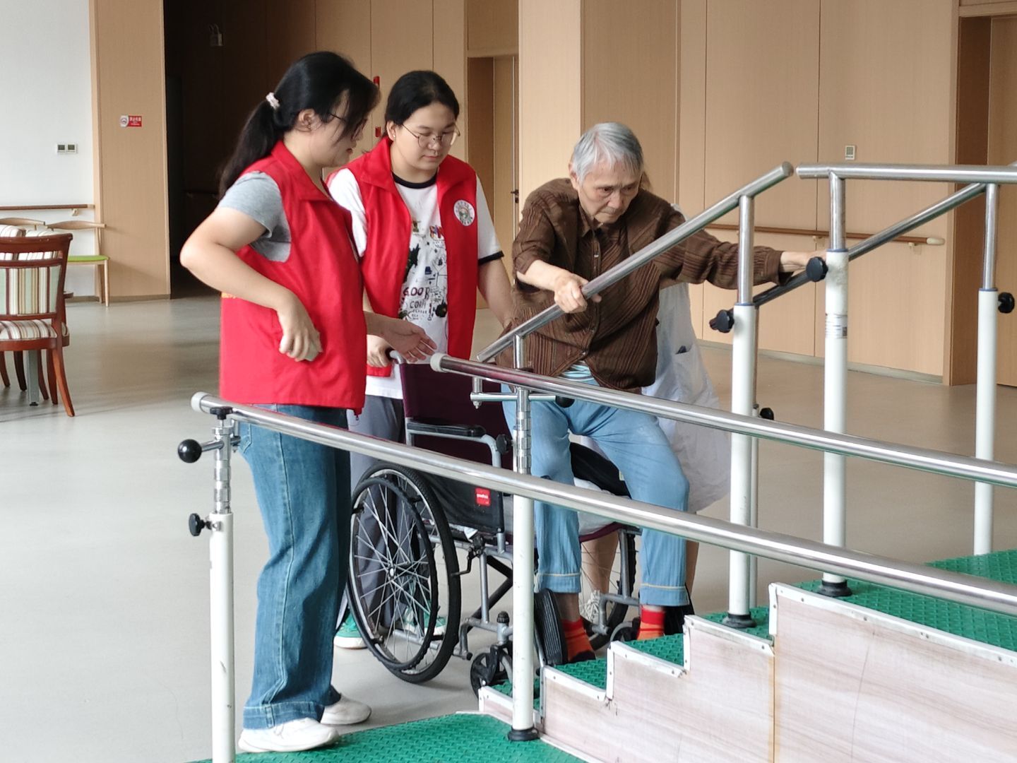 護理組的工作充滿專業(yè)性與挑戰(zhàn)性。他們負責帶老年人進行復健訓練,根據(jù)老人的身體狀況制定個性化的訓練方案,從簡單的肢體活動到康復器械訓練,全程悉心指導與保護。在運送老人上下樓時,更是小心翼翼,時刻關注老人的安全,用溫暖的話語安撫老人,讓老人在移動過程中感受到安心。