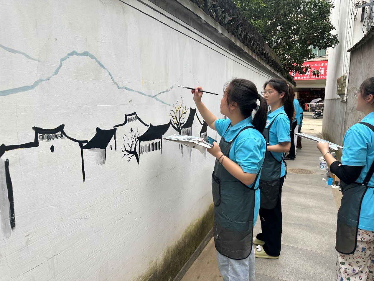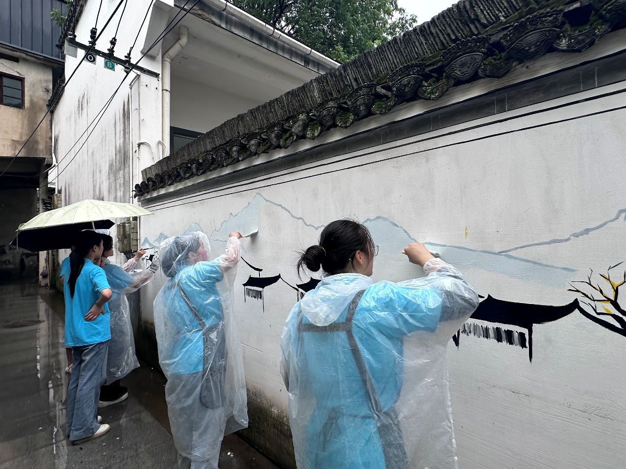 午后,盡管天降雨露,實踐團仍冒雨啟動墻繪活動。成員們分工協作,以灰白墻面為天然畫布,巧妙融入山水輪廓、徽派民居等地域元素,用流暢線條,將鄉村自然風光、人文底蘊轉化為生動藝術圖景。