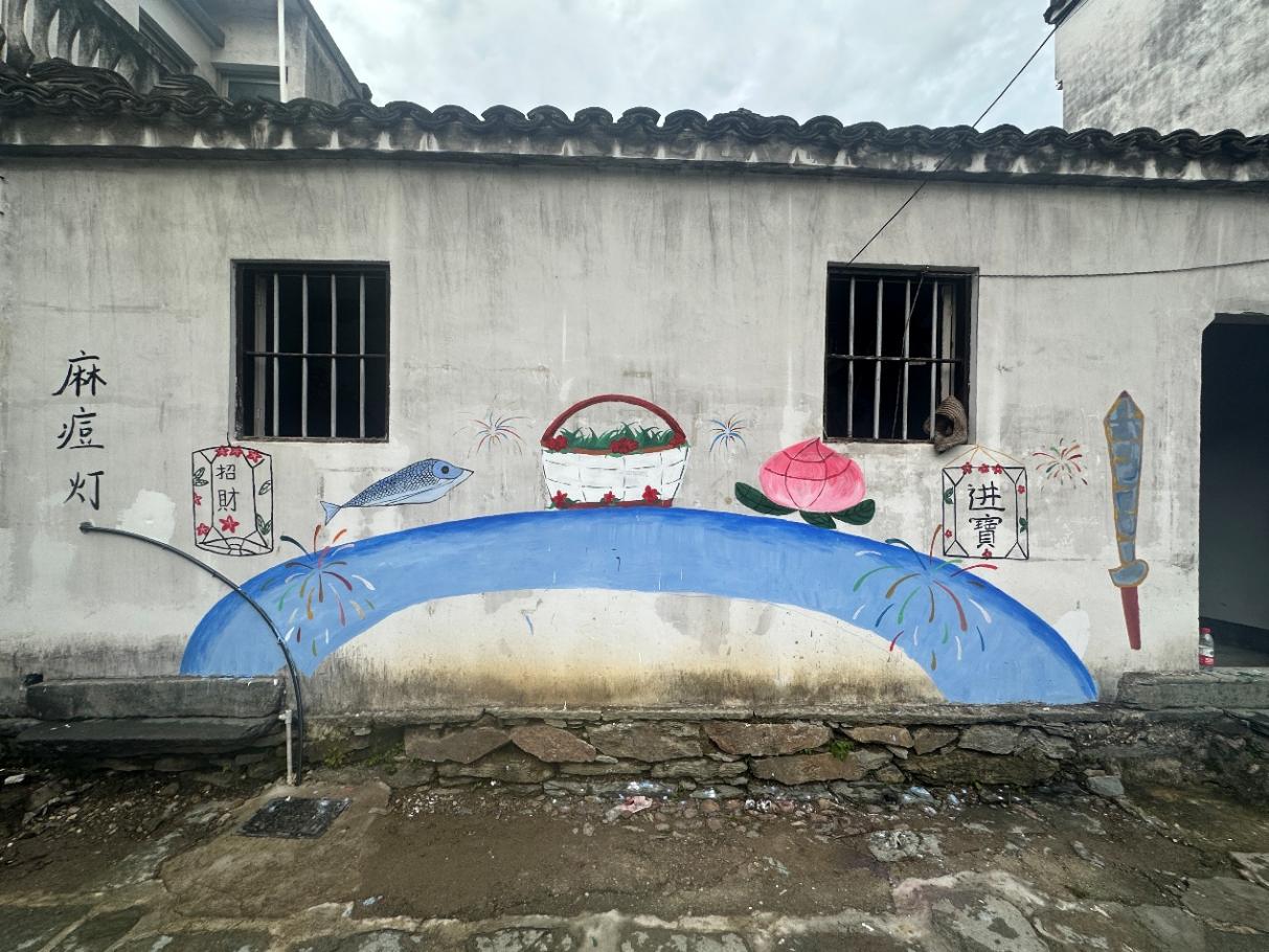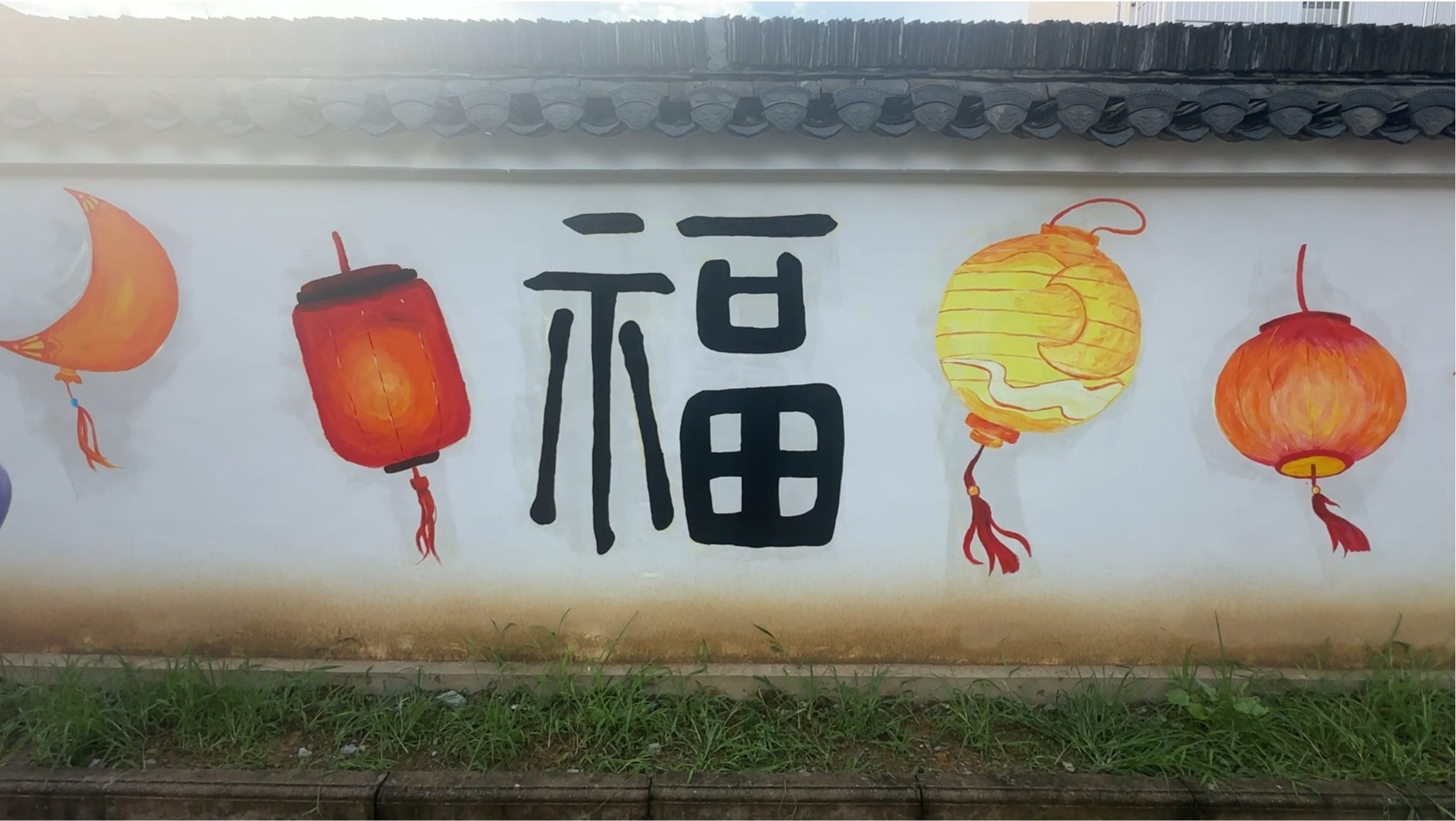實(shí)踐期間,團(tuán)隊(duì)高質(zhì)量完成三幅主題墻繪創(chuàng)作:以“山水民居”系列還原徽派建筑與自然生態(tài)的和諧之美,通過(guò)青磚黛瓦、層巒溪流的藝術(shù)重構(gòu)展現(xiàn)地域風(fēng)貌;以“福蘊(yùn)鄉(xiāng)村”主題融合傳統(tǒng)“福”字、吉祥燈籠與清廉蓮花等符號(hào),傳遞民俗愿景與時(shí)代文化內(nèi)涵;以“麻痘燈影”非遺主題再現(xiàn)千年地戲盛景,通過(guò)藝術(shù)化創(chuàng)作讓傳統(tǒng)民俗在現(xiàn)代墻面上煥發(fā)新生。