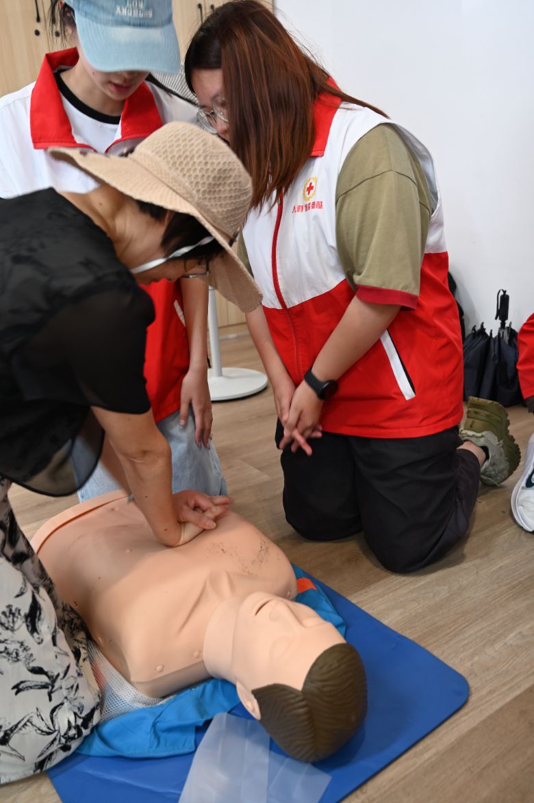 講解結束后是實操環節。現場氣氛熱烈而融洽,老人們對此次活動表現出了濃厚的興趣和高度的熱情,紛紛積極參與到實踐操作中來。盡管部分老人年事已高,學習新技能存在一定困難,但在成員們的耐心指導下,他們逐漸掌握了基本的急救操作要領。老人們排著隊輪流上前練習,小隊成員則一對一耐心指導,糾正動作細節。其中一位穿粉色上衣的奶奶格外引人注目,她始終面帶笑容,一遍遍向隊員請教心肺復蘇的按壓深度、海姆利克法的發力技巧,反復練習直至動作標準。