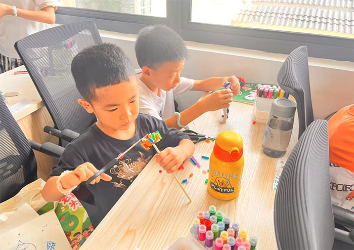 在支教活動(dòng)中,實(shí)踐團(tuán)以多元課程激發(fā)學(xué)生興趣與潛能。英語(yǔ)課堂上,成員通過(guò)情景對(duì)話與單詞游戲,讓學(xué)生在趣味中快速掌握詞匯,同時(shí)培養(yǎng)自信心;趣味數(shù)學(xué)課堂突破傳統(tǒng)教學(xué)模式,借助購(gòu)物算賬等生活案例,將數(shù)學(xué)知識(shí)巧妙融入實(shí)踐;手工課上,五顏六色的扭扭棒成為孩子們創(chuàng)意的載體,一件件精美的手工作品彰顯著他們的想象力與創(chuàng)造力;戶外活動(dòng)時(shí)間,實(shí)踐團(tuán)帶領(lǐng)孩子們?cè)陉?yáng)光下開展吹泡泡等游戲,讓孩子們?cè)诒寂苕覒蛑性鰪?qiáng)體質(zhì),在與同伴的互動(dòng)中提升溝通協(xié)作能力。