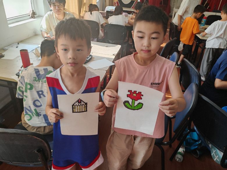 基于《神奇的像素畫之旅》數(shù)字藝術課程,孩子們通過像素格構圖原理,用電子畫板創(chuàng)作出寶可夢、花朵等數(shù)字作品。“每個像素格都是作品的‘DNA’!”實踐隊員在教學中類比生物學概念,幫助孩子理解數(shù)字藝術與自然規(guī)律的共通性。