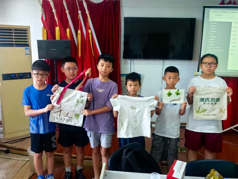 結合《植物敲拓染實踐》課件,團隊將傳統(tǒng)印染技藝搬進社區(qū)。在嚴格遵循安全規(guī)范的前提下,孩子們用木槌敲打新鮮植物,在棉麻布料上拓印出樹葉脈絡的天然紋樣。課程特別強調環(huán)保理念,實踐隊員指導學員分類處理植物殘渣,并科普秦漢時期草木染技藝的歷史傳承。