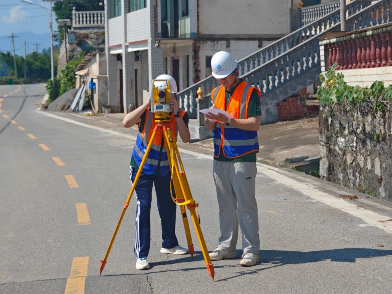 服務團采用現場勘探、高清數字攝像機、無人機、全站儀、地質羅盤、高清奧維地圖等專業手段,對爐竹村內邊坡進行檢測。檢測過程中,團隊成員葉智超結合全站儀和地質羅盤測得的數據,以及現場邊坡實際情況進行分析。由于今年上半年雨水頻繁,部分邊坡已發生垮塌。