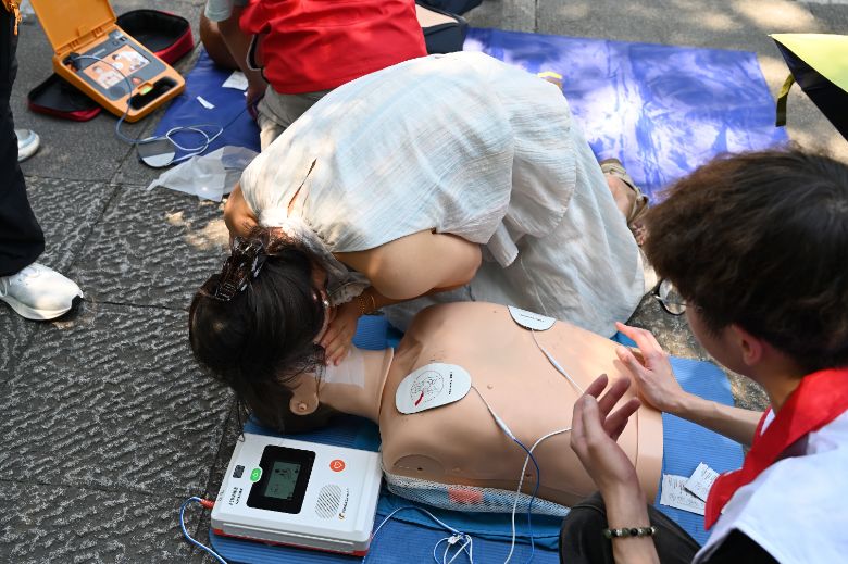 在實操教學環節,我們拿出模擬人道具,現場演示心肺復蘇的標準操作流程。從判斷現場環境安全、拍打患者雙肩呼叫,到胸外按壓的深度、頻率,再到人工呼吸的要點,每一個步驟都細致入微。活動吸引了各年齡段人群的參與:有來自外地的大學生、結伴游玩的孩童、散步路過的老人,也有周邊工作的青年;不少本是來景區游玩的旅客,見此場景也主動駐足學習,紛紛表示“這類知識太重要了,關鍵時刻能救命”。一位帶著孩子的家長在嘗試完心肺復蘇按壓后,感慨道:“以前覺得急救是醫生的事,現在親手操作才知道,掌握這些技能并不難,關鍵時刻真的能救人一命。”
