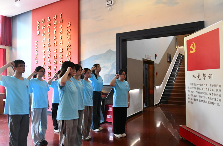 社會實踐隊員在舊址展廳內面對黨旗莊嚴宣誓。鏗鏘誓言詮釋使命擔當,宣誓儀式也將歷史現場轉化為生動的黨性教育課堂。