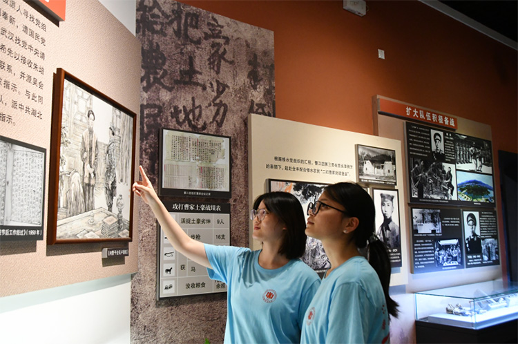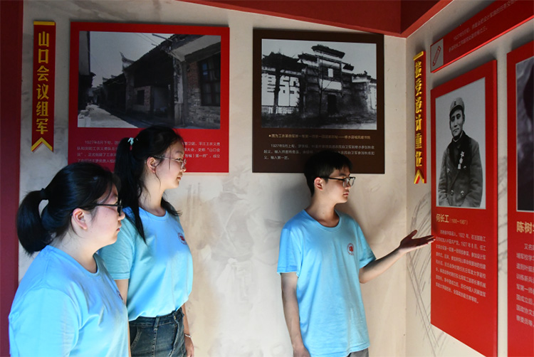 社會實踐隊首站抵達工農革命軍第一軍第一師師部舊址。在舊址內,隊員們通過觀察會議桌、武器、生活用品、軍旗設計手稿等物品,沉浸式感受波瀾壯闊的革命歲月。