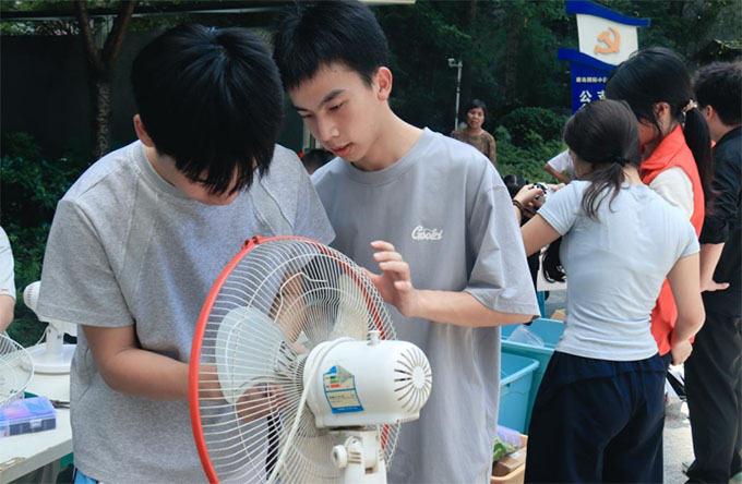 “巧手”解難,服務鄉鄰零距離 促進團隊一抵達社區,便迅速在廣場設立便民服務點。聽聞大學生志愿者前來義務維修,居民們紛紛送來家中“罷工”的電風扇、電飯煲、臺燈等小家電。隊員們化身“家電醫生”,運用專業知識細致檢測、精準排故。螺絲刀與電烙鐵在指尖翻飛,汗水浸潤著專注的臉龐,一件件故障電器在巧手中重獲新生。一位拿到修好電扇的老伯連聲道謝:“這些小東西修起來麻煩,扔了可惜,多虧了這些能干的大學生娃娃!”維修現場儼然成為社區里最溫暖的便民驛站。