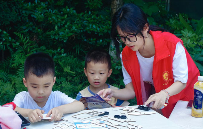 “匠心”啟智,科學探索趣味濃 與此同時,另一支小隊將廣場的另一半變成了充滿童趣與創造力的“未來工程師”工坊。圍繞激發小朋友科學興趣的核心目標,志愿者們精心設計了太陽能小車手工課。“大家看,陽光就是小車的‘隱形電池’!”隊員用生動的語言揭開太陽能板將光能轉化為電能的奧秘。孩子們在指導下,小心翼翼地拼接齒輪、連接線路、安裝光板。當一輛輛親手組裝的小車在陽光下歡快跑動,孩子們眼中迸發出興奮的光芒:“我的小車跑起來啦!太陽真的好厲害!”成功的喜悅與科學的種子,在此刻一同生根發芽,激勵孩子們不斷追求知識、勇于探索未知,最終綻放出屬于他們自己的科技之花。