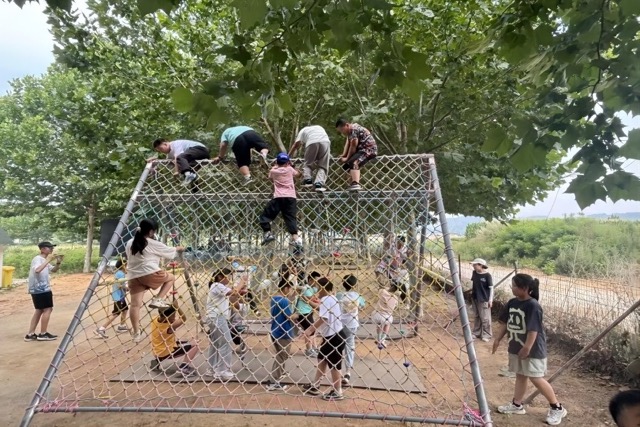 下午,支教隊(duì)員攜手農(nóng)場(chǎng)主 “黑叔”,為孩子們帶來(lái)了一堂別開(kāi)生面的野外實(shí)踐課。在廣闊的戶外場(chǎng)地,孩子們率先勇敢地匍匐穿過(guò)沙地,指尖觸碰著細(xì)膩的沙粒,感受著大地的獨(dú)特質(zhì)感;緊接著,在支教隊(duì)員的保護(hù)下,他們小心翼翼地攀上樹(shù)干,成功敲響鈴鐺的那一刻,挑戰(zhàn)自我的喜悅在臉上綻放;轉(zhuǎn)而來(lái)到攀爬架前,孩子們憑借頑強(qiáng)的毅力和勇氣,一步一步向上攀登,身影在陽(yáng)光下愈發(fā)堅(jiān)毅;隨后,小小的身軀開(kāi)始在沙地上奮力拖動(dòng)輪胎,盡管額頭滲出細(xì)汗、呼吸略顯急促,但眼神中始終滿是堅(jiān)定;在搬運(yùn)木樁、利用繩索拉起重物時(shí),孩子們的每一次發(fā)力都展現(xiàn)出不服輸?shù)捻g勁;最后,孩子們依次爬過(guò)長(zhǎng)長(zhǎng)的黑色圓筒,順利完成了所有挑戰(zhàn)項(xiàng)目。孩子們?cè)谟H身體驗(yàn)中收獲知識(shí)與技能,鍛煉了體能與意志。
