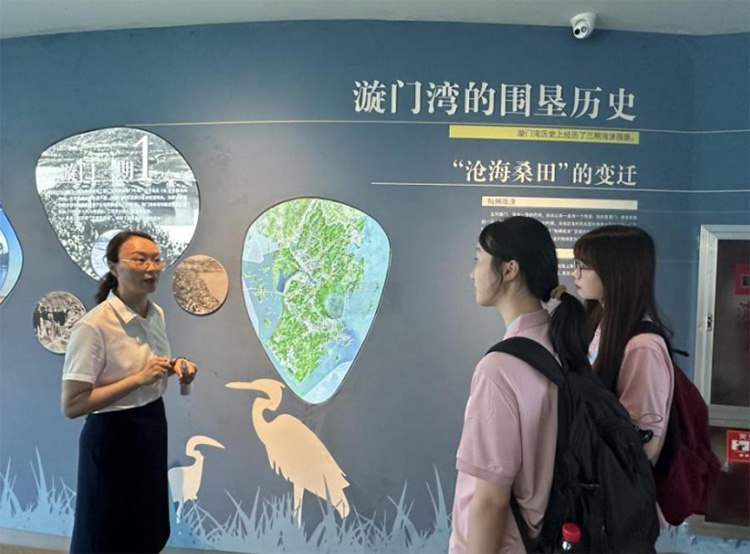 發(fā)展歷程:從圍墾灘涂到生態(tài)明珠的涅槃 呂科長(zhǎng)首先帶領(lǐng)實(shí)踐團(tuán)來(lái)到漩門灣濕地公園科普館,在這里為實(shí)踐團(tuán)介紹了漩門灣的故事,這是一部人與自然相互塑造的壯麗史詩(shī)。漩門灣的形成源于古代地殼運(yùn)動(dòng),造就了獨(dú)特的漩門海峽。然而,真正改變其面貌的是上世紀(jì)七十年代起的三期大規(guī)模圍墾工程,這些工程在解決土地資源短缺的同時(shí),也深刻改變了海灣的自然生態(tài)格局。正是在一期、二期圍墾工程形成的基礎(chǔ)上,生態(tài)保護(hù)的意識(shí)開(kāi)始覺(jué)醒。訪談中,呂科長(zhǎng)向我們展示了這片土地從“人定勝天”的圍墾時(shí)代,到生態(tài)意識(shí)覺(jué)醒、科學(xué)修復(fù)保護(hù),最終成為“鳥類天堂”和“觀鳥勝地”的艱辛歷程。實(shí)踐團(tuán)成員們認(rèn)真聆聽(tīng)、詳細(xì)記錄,并不時(shí)追問(wèn)細(xì)節(jié),力求理解生態(tài)修復(fù)背后的科學(xué)理念與管理智慧。實(shí)踐團(tuán)成員深刻感受到,漩門灣的蛻變史,正是一部生動(dòng)的“綠水青山就是金山銀山”理念實(shí)踐教科書。