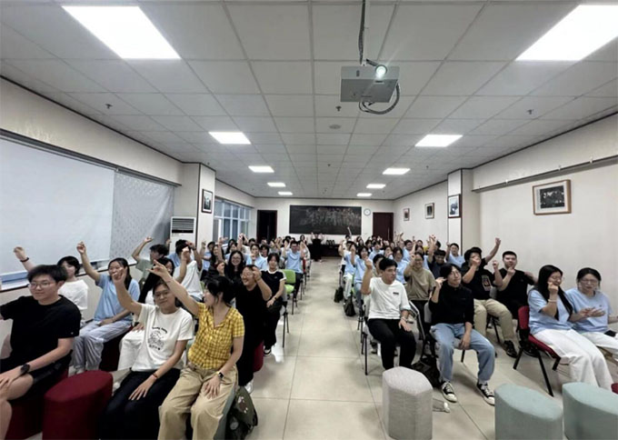 夜幕降臨,綜合樓302教室的燈光點(diǎn)亮。張冉、王瀅兩位老師以“歌聲中的紅色記憶”為鑰,叩開情感之門。《映山紅》的旋律響起,“夜半三更喲盼天明,寒冬臘月喲盼春風(fēng)”,學(xué)員們輕聲跟唱,眼前浮現(xiàn)出送郎當(dāng)紅軍的客家妹子身影;當(dāng)《沒有共產(chǎn)黨就沒有新中國》的合唱響起,整齊的歌聲穿透窗欞。這不再是簡單的傳唱,而是跨越歷史的精神呼應(yīng)。