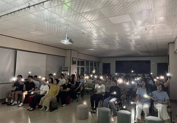 實(shí)踐團(tuán)成員以手電筒模仿星星之火 尤淇 攝
