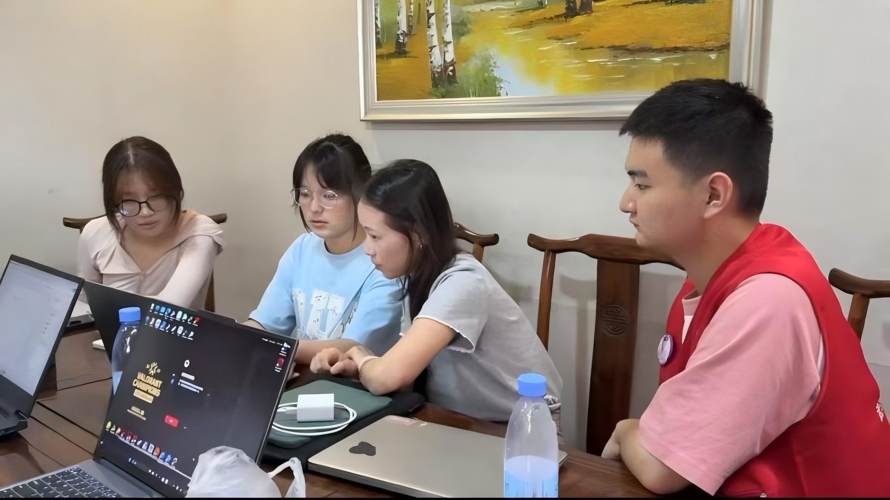 圖1:志愿者們進行宣誓開班儀式結束后,下午14時30分,實踐隊隊員前往酒店會議室集中開展“兩彈一星”主題調研籌備工作。隊員們分工協作,圍繞“兩彈一星”精神內涵、歷史背景及當代價值,系統梳理相關史料文獻,著手撰寫調研報告框架,同時結合青少年認知特點,設計針對性調查問卷,旨在后續課程中收集青少年對這一歷史事件的認知程度與興趣點。