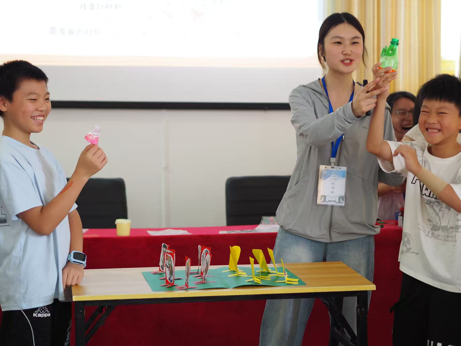 活動伊始,實踐隊員以“看不見的力量”為切入點,向孩子們拋出問題:“空氣能像炮彈一樣發射嗎?”隨后,團隊成員利用廢舊水瓶、氣球和膠帶制作簡易“空氣炮”,通過拉拽氣球噴射空氣漩渦擊倒紙杯塔。這一神奇的現象瞬間吸引了孩子們的目光,他們紛紛舉手,迫不及待地想要親自嘗試操作。“原來空氣真的有力量!就像隱形的大手!”孩子們興奮地說道,眼中閃爍著對科學的驚嘆與好奇。在孩子們沉浸于科學實驗帶來的驚喜時,實踐隊員巧妙地結合實驗現象,用通俗易懂的語言講解了伯努利原理和氣壓知識。他們引導孩子們思考生活中的類似現象,如“為什么地鐵站要設置安全黃線”“電風扇為什么能吹出風”。通過“觀察—實踐—聯想”的教學設計,將原本抽象的科學知識被轉化為可觸可感的實際體驗,孩子們在輕松愉快的氛圍中,逐步揭開了科學的神秘面紗。