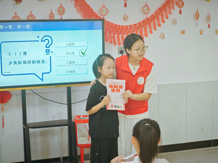 在少先隊旗的宣講中,星星火炬旗的寓意被生動解讀。火炬象征光明,紅旗的一角象征革命先烈的鮮血染成,五角星代表中國共產黨的領導,激勵著少先隊員繼承革命傳統,為共產主義事業時刻準備著。