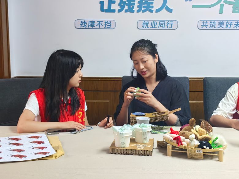 “殘疾人之家是第一道港灣,真正走向社會還需專業力量。”善達未來助殘服務中心正搭建就業轉化橋梁。面對肢體障礙、聽障、心智障礙等多元群體,善達未來摸索出適配路徑:為聽障設計師組建專屬項目組,由“橋梁”主管協調溝通;為外向心智障礙者開拓市集崗位,采用“聽障+心智障礙”融合搭檔模式。其開發的“聊贈一杯春”文創茶品,包裝附二維碼展示殘障伙伴工作場景,環保小包裝設計在市集廣受歡迎,讓殘障伙伴的努力被社會看見。負責人陳咪老師直言: