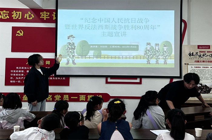 在“紀念中國人民抗日戰爭暨世界反法西斯戰爭勝利80周年”主題宣講中,志愿者們通過歷史事件回顧、英雄事跡分享等方式,帶領孩子們重溫那段艱苦卓絕的崢嶸歲月,讓他們銘記歷史、緬懷先烈,激發了強烈的愛國情懷和民族自豪感。