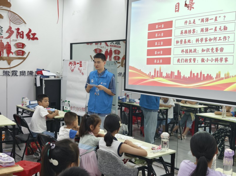 西楚社區(qū)小朋友在課堂中認(rèn)真聽(tīng)講,積極互動(dòng),對(duì)“兩彈一星”產(chǎn)生了濃厚興趣。課堂結(jié)束后與宣講團(tuán)交流相關(guān)知識(shí)并于宣講團(tuán)合影留念。