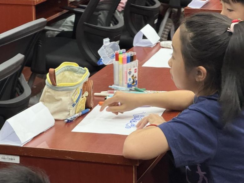 10時,“小船舶,大世界”美術課拉開帷幕。課程伊始,朱肇宇同學以船舶構造為切入點,深入淺出地介紹了船舶的基本結構與功能,隨后引導孩子們發揮想象,自由創作心中的船舶形象。團隊成員分發了畫紙與彩筆,孩子們立刻投入創作,有的細致勾勒船舶輪廓,力求逼真;有的則大膽想象,為船舶添上幻想色彩。創作過程中,團隊成員穿梭其間,不時俯身與孩子們交流創作思路,鼓勵他們大膽創新。一幅幅充滿童趣與創意的船舶畫作逐漸誕生,承載著孩子們對航海世界的無限憧憬。