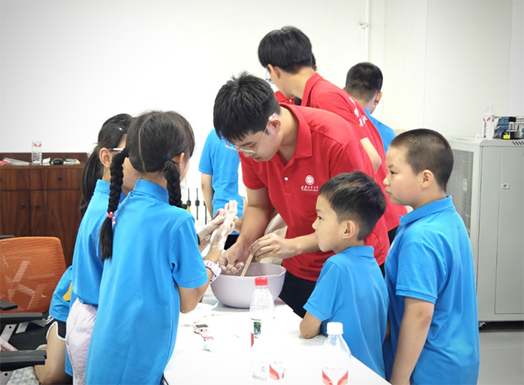 實(shí)踐隊(duì)員為孩子們講述及與其共同制作非牛頓流體。張?chǎng)H沄 供圖