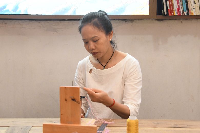 重慶市涪陵區(qū)結繩藝術職業(yè)技能培訓學校副校長李學敏講述她與結繩結緣的故事,還為團隊成員演示編織過程。