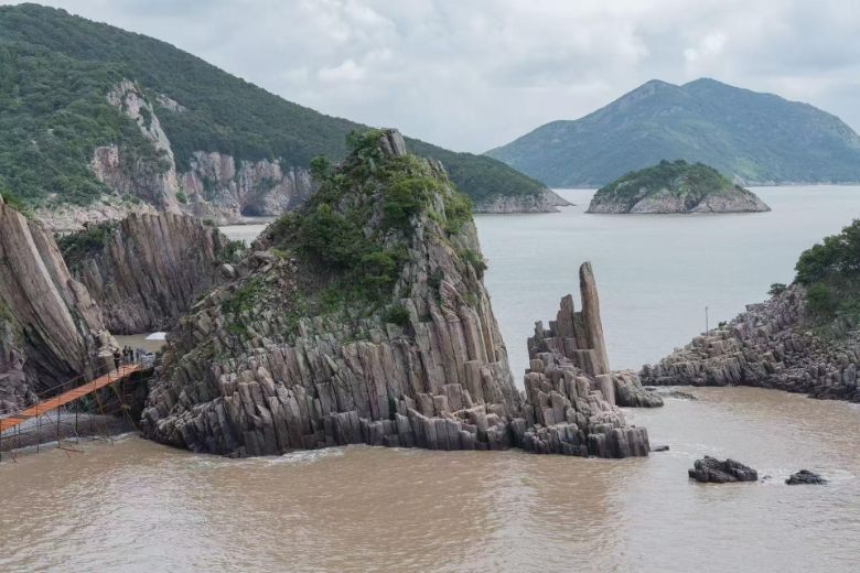 如果說上午的行程是歷史的回響,那么下午的探索則是一場自然的奇遇。古樟沙灘上,退潮留下的水洼里,小螃蟹驚慌地橫著身子逃竄,貝殼在陽光下閃爍著微光。零星幾個趕海的人提著竹籃,熟練地在礁石間翻找海螺和蟶子。花岙島東南岸的石林,堪稱地質奇跡——在這里數萬根灰黑色的六棱石柱整齊排列。海浪拍打在石柱上,濺起雪白的浪花,又退去,周而復始。石壁上的蜂窩狀孔洞,像是被歲月啃噬的痕跡,陽光穿過,在巖面上投下斑駁的光影。當地人稱之為“龍鱗巖”,傳說這是龍王在此歇息時留下的鱗片。