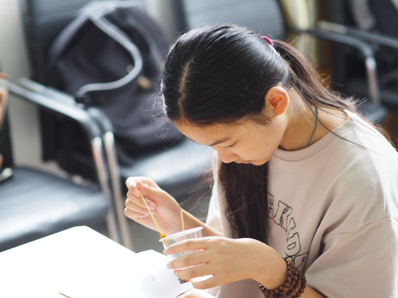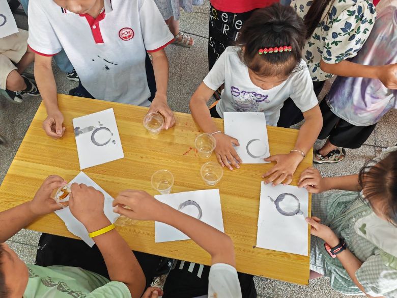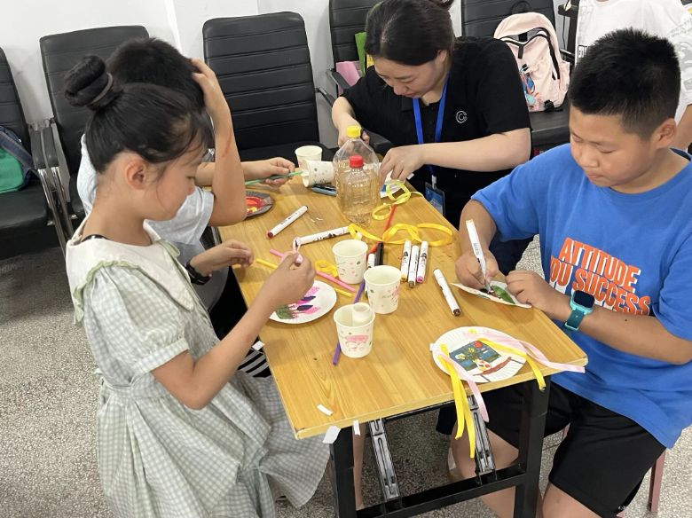 最后進行的手工創作環節,將活動推向了高潮。實踐隊為孩子們發放了一次性杯子、碟子、彩紙、彩筆等材料,鼓勵大家發揮想象力,自由創作手工藝品。拿到材料后,孩子們立刻投入到創作中:有的用彩紙和杯子制作出了可愛的小動物,有的在碟子上畫出了五彩斑斕的風景畫,還有的將杯子和碟子組合起來,搭建出了迷你“城堡”。