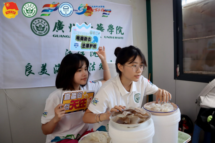 青春帶貨,讓海蜇走出鄉(xiāng)村 下午,電商組的隊(duì)員們準(zhǔn)時(shí)來到布置妥當(dāng)?shù)闹辈?chǎng)地,一場(chǎng)助力海蜇銷售的首次直播正式拉開帷幕。