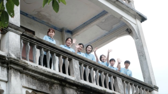 圖為海南大學(xué)海德書(shū)院椰韻繪彩支教服務(wù)實(shí)踐團(tuán)成員在溪北書(shū)院建筑參觀合照