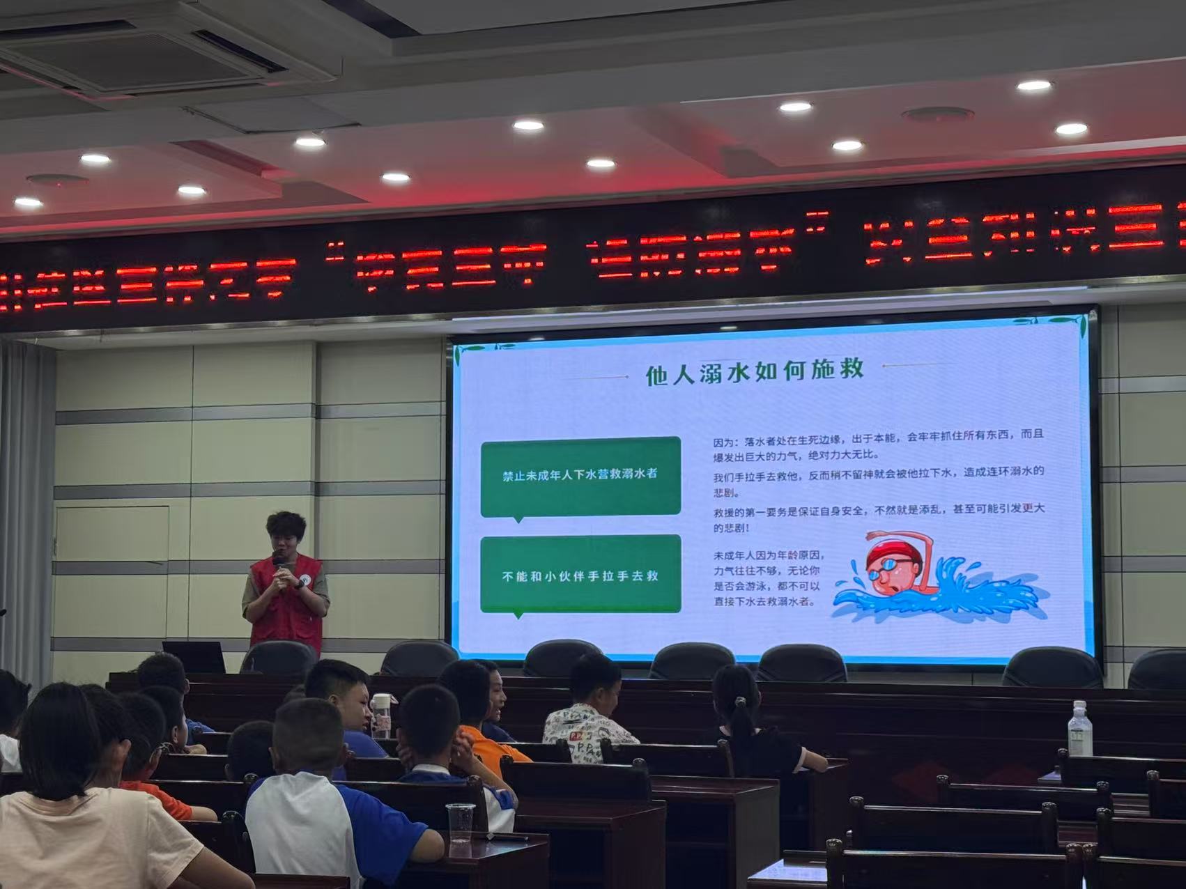 《防溺水知識課堂》則以 “實踐演練 + 趣味互動” 筑牢安全防線。隊員們用玩偶演示 “溺水自救” 動作,講解 “六不準” 原則時,穿插 “安全知識拍手歌”:“陌生水域我不去,同伴落水喊大人……” 朗朗上口的童謠讓知識入腦入心。模擬 “救生員救援” 游戲中,孩子們分組練習 “拋漂浮物”“大聲呼救” 等技能,在歡笑中掌握關鍵自救方法。