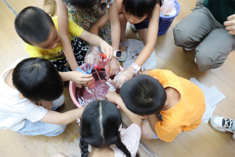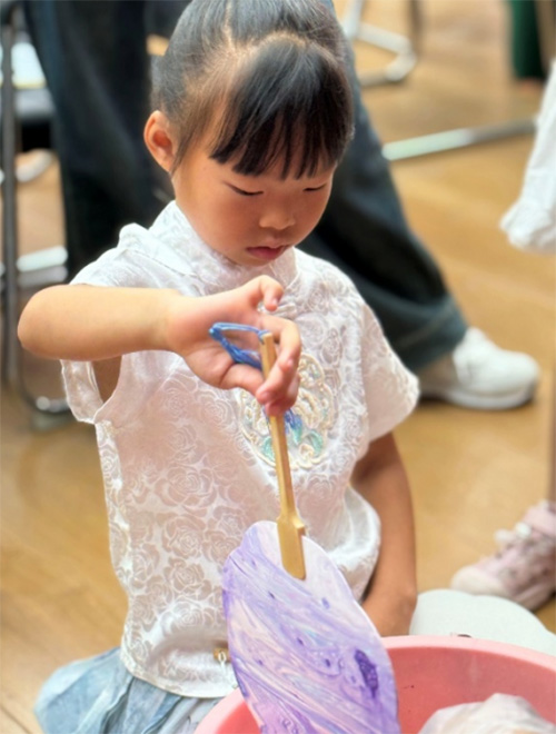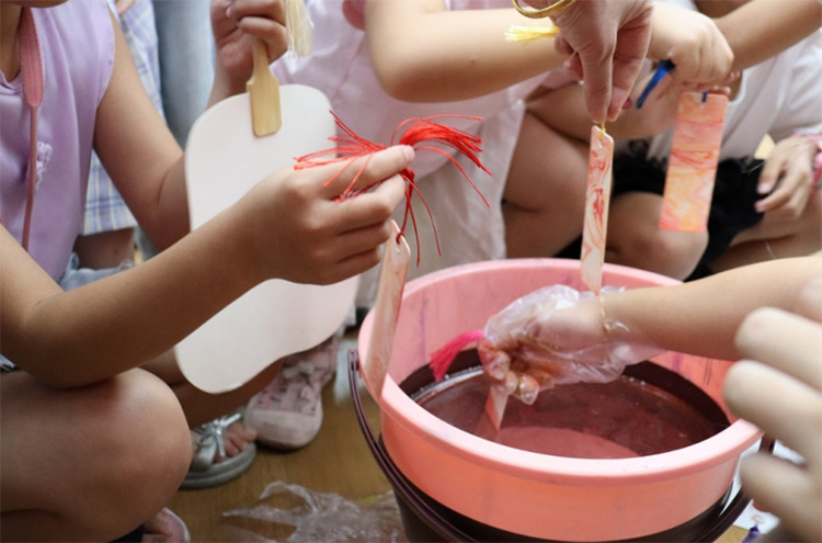 漆扇制作作為中國傳統非遺技藝的代表之一,其歷史可追溯至唐宋時期。活動開展前,稚語傳情·阡陌耕心實踐隊為參與本次活動的小朋友們準備好了所材料。活動開始,由實踐隊隊長曾虞芯向小朋友們介紹漆扇的制作過程,在一陣驚嘆聲中,一把漆扇就此完成。隨后由小朋友們手持素扇,根據自己的喜好在水中自由揮灑彩墨,利用水流形成的自然紋路,轉印出獨一無二的扇面圖案。現場參與的小朋友熱情高漲,積極投入到活動中,一把把獨特的漆扇悄然誕生。“我還想再做一把!”這是在場小朋友們說過最多的一句話。