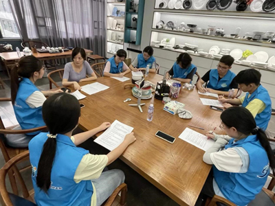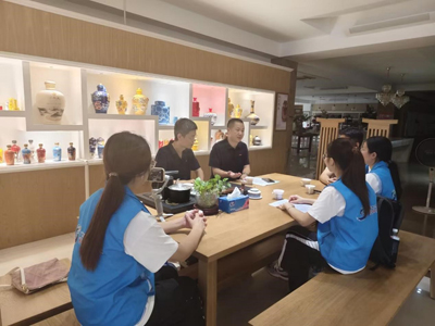 7月7日,“振興燎原”突擊隊赴池湖日用陶瓷批發中心開展全面調研。發放問卷前,團隊對市場部分企業進行預調研,確保問卷的可行性。通過問卷的形式,收集了大量陶瓷企業的相關數據,對潮州市陶瓷企業具體情況有了初步認識。首次調研結束后,團隊立即召開工作會議,整理數據并調整后續調研方案。