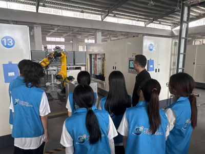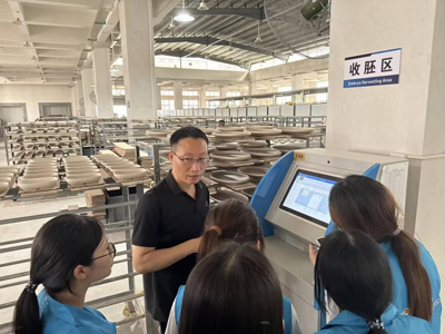 同日下午,團隊來到廣東金強藝陶瓷實業有限公司,該公司數字化轉型走在行業前端,去年獲得中國陶瓷工業協會授予的“中國輕工陶瓷行業數字化轉型先進企業”稱號,對團隊研究企業數字化轉型成功案例有重大作用。葛董和譚總非常熱情地帶著團隊參觀公司的生產線。團隊穿梭在企業錯綜復雜的車間里,腳步匆匆卻目光如炬,才驚嘆于釉料上色的精妙轉眼又為智能窯爐的精準控溫駐足。每一個生產環節都讓隊員們流連忘返,相機里存滿了傳統技法與工藝流程結合的珍貴影像。在這傳統與現代交織的工業迷宮中,調研團隊正以敏銳的觀察力和飽滿的熱情,解碼著楓溪陶瓷產業轉型升級的每一個關鍵細節。