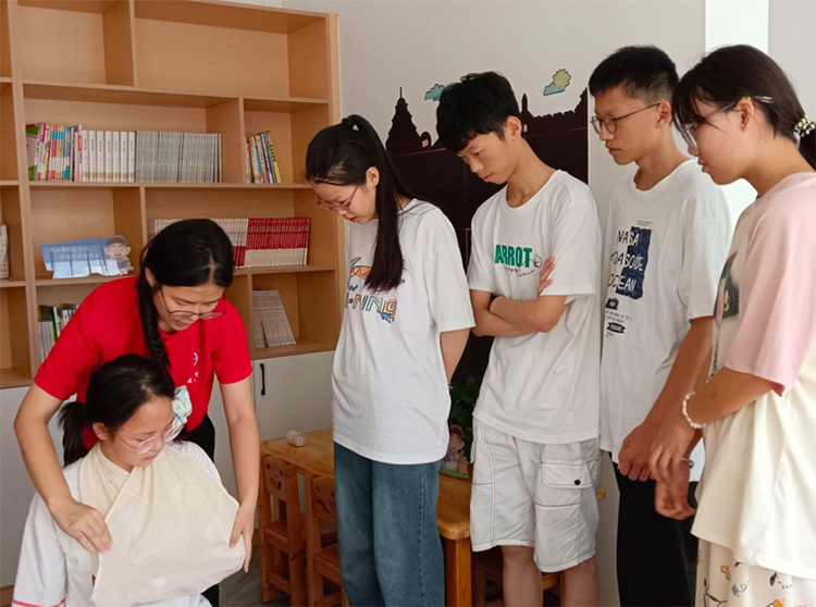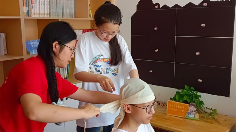 圖為實踐隊隊員為徐市中學學生演示如何進行頭部包扎(黃雅卿 供圖)