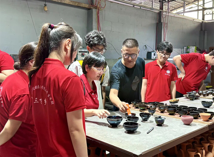 圖為潘盞柜建盞文化產業示范基地潘賢森總經理為實踐隊詳細介紹基地內的建盞成品(何淼 供圖)