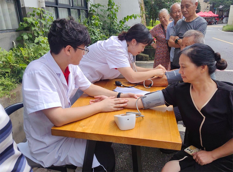圖為實踐隊隊員為徐市鎮居民測量血壓(王璐 供圖)