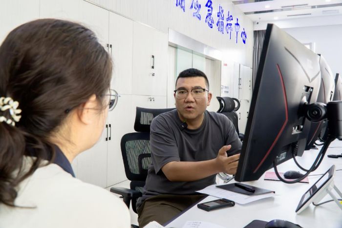 圖為省路網中心領導向實踐隊介紹青海省實時交通數據