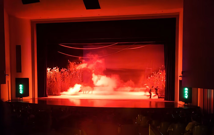 (二)紅霧驟起:一秒點燃的情緒風暴 20:46分,舞臺突然被紅色吞沒。濃煙里,兩個演員撕心裂肺地掙扎,像是被命運推搡的困獸。燈光從刺眼的紅,漸漸褪成血色的暗,背景音里的浪濤聲突然靜止,整個劇場仿佛被按了靜音鍵。我站在側門,看見第一排的大叔攥緊了拳頭,后排的姑娘用紙巾捂住嘴,連呼吸都變得小心翼翼。