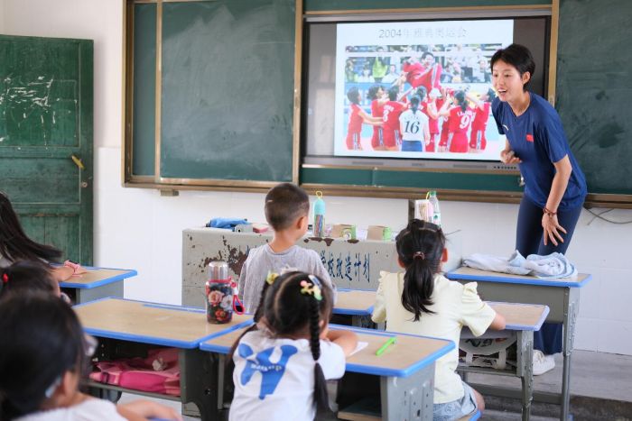 曾獲第十三屆全運會女子排球21歲以下組冠軍的李雪銀老師,為孩子們帶來了兩堂意義非凡的排球課。課堂上,她從排球的起源講起,娓娓道來這項運動傳入中國后的發展脈絡,更著重講述了“女排精神”的內核——從1981年首奪世界冠軍的“為國爭光”,到里約奧運會逆境翻盤的“永不言棄”,再到新時代傳承的“團結協作、頑強拼搏”。