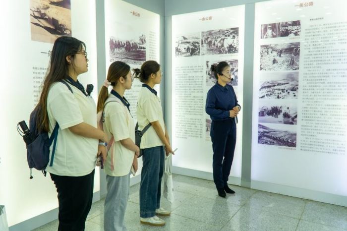 圖為實踐隊聆聽講解員講解青藏公路紀念館“一條公路”主題展