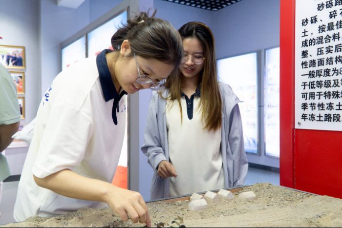 格爾木總段公路文化展示館實踐隊來到格爾木總段公路文化展示館。館內展出的大大小小的沙盤模型和“老物件”,都是格爾木總段職工親手制作以及捐贈的珍貴物品。四個不同時期的公路沙盤讓實踐隊員們了解了格爾木公路的發展歷史,格爾木總段護路工人吳戰瑞、車慶禮等的故事讓實踐隊員們感受到護路工人的堅守,新舊修路機械、養護機械的對比讓隊員們感受到筑路和修路的不易。這里的每一件展品都像是一位無聲的講述者,訴說著那段波瀾壯闊的歷史。
