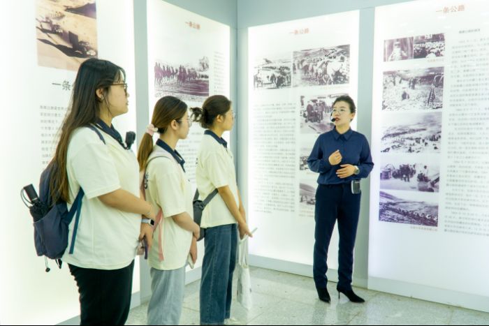 在講解員的帶領下,實踐隊師生參觀學習了“一位將軍”“一條公路”“一個奇跡”“一段歷史”“一座新城”五個板塊主題展,了解筑路大軍在財力匱乏、技術短缺、自然環境極為惡劣的情況下,齊心協力征服重重天險,創造公路建設史上的奇跡,以及青藏公路與格爾木市的不解之緣。館內陳列展出的的格爾木第一批住房“帳篷”、慕生忠將軍種下的第一棵樹照片、慕生忠將軍插在格爾木的鐵鍬模型,讓實踐隊深刻了解了青藏公路從零到有的筑路歷程,身臨其境般體驗到青藏公路修建的艱辛。